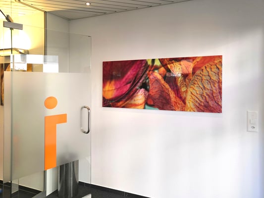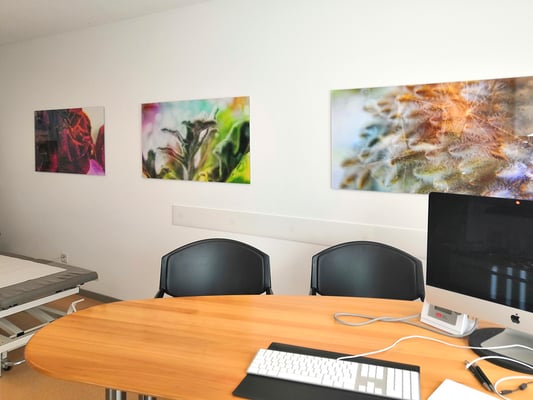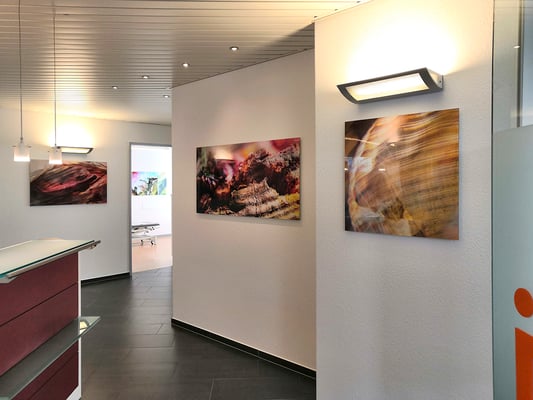 15 Bildtafeln aus der Serie «macro colored», verschiedene Formate, echter Fotoabzug hinter Acrylglas. In der Praxis am Rennweg, Niederrohrdorf